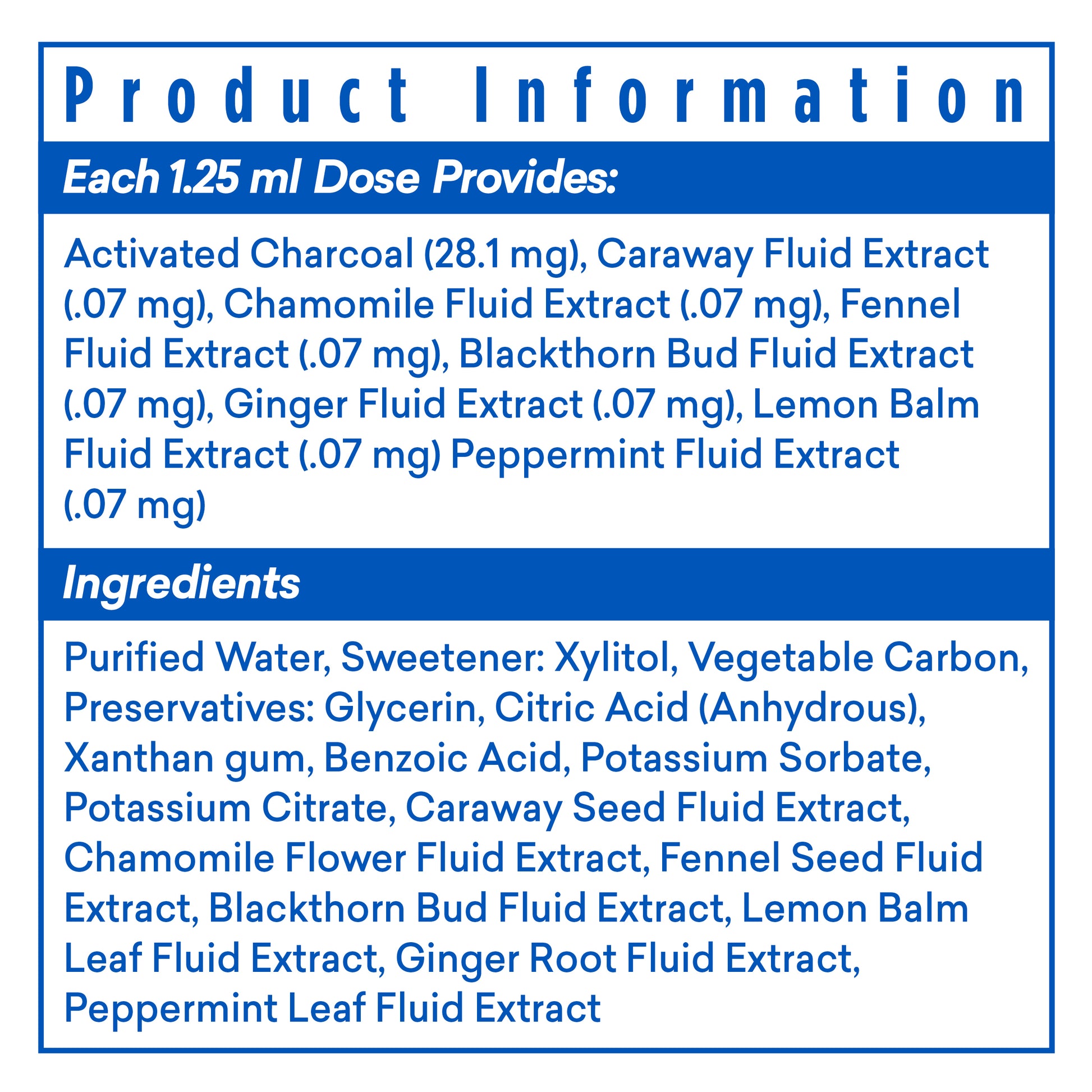 Activated Charcoal, Sloe Bud Extract, Caraway Seed Extract, Chamomile Flower Extract, Fennel Seed Extract, Ginger Root Extract, Lemon Balm Leaf Extract, Peppermint Leaf Extract. Water, Xylitol, Glycerin, Citric Acid, Benzoic Acid (preservative), Potassium Sorbate (preservative), Xanthan Gum, Potassium Citrate.